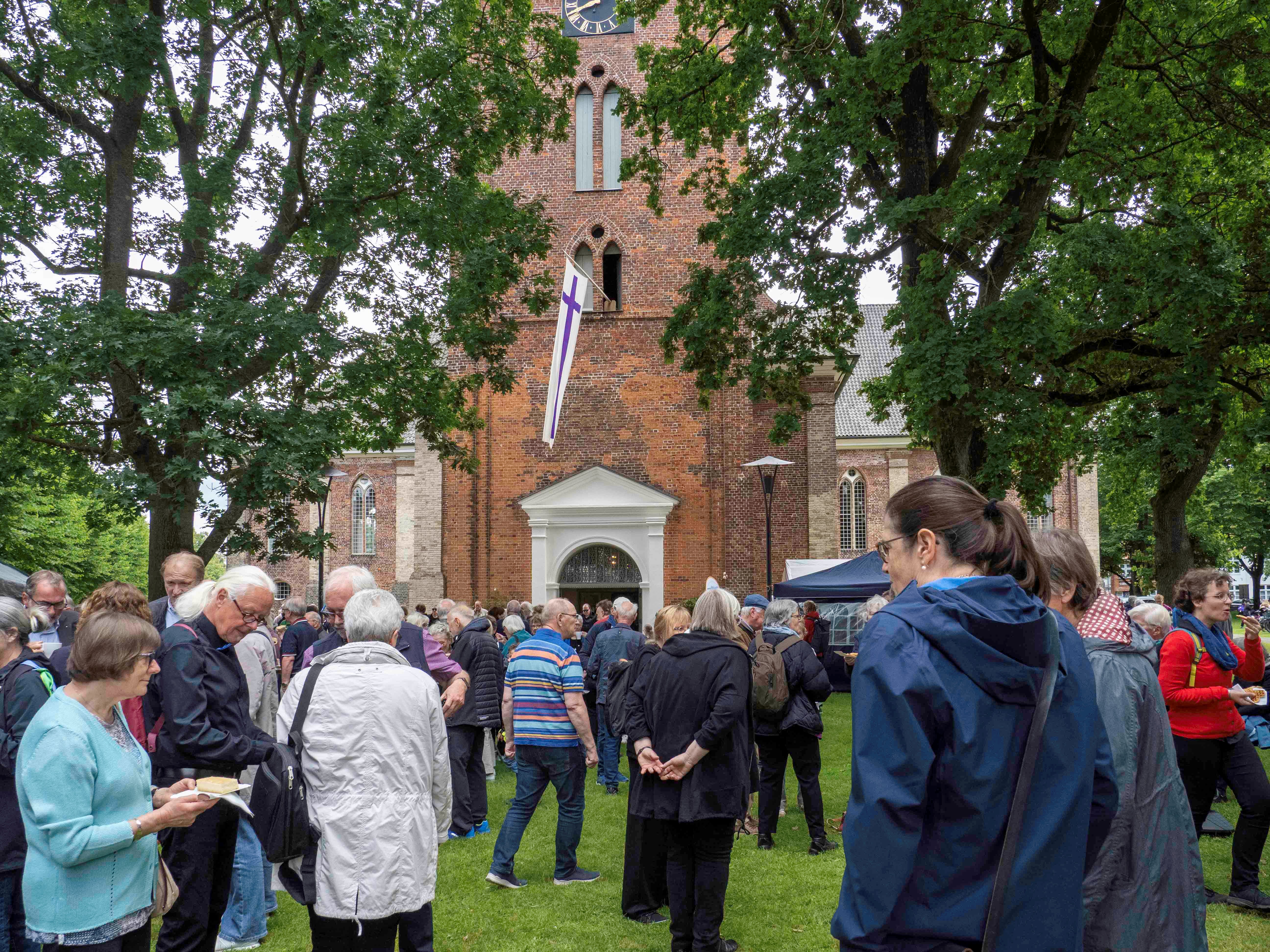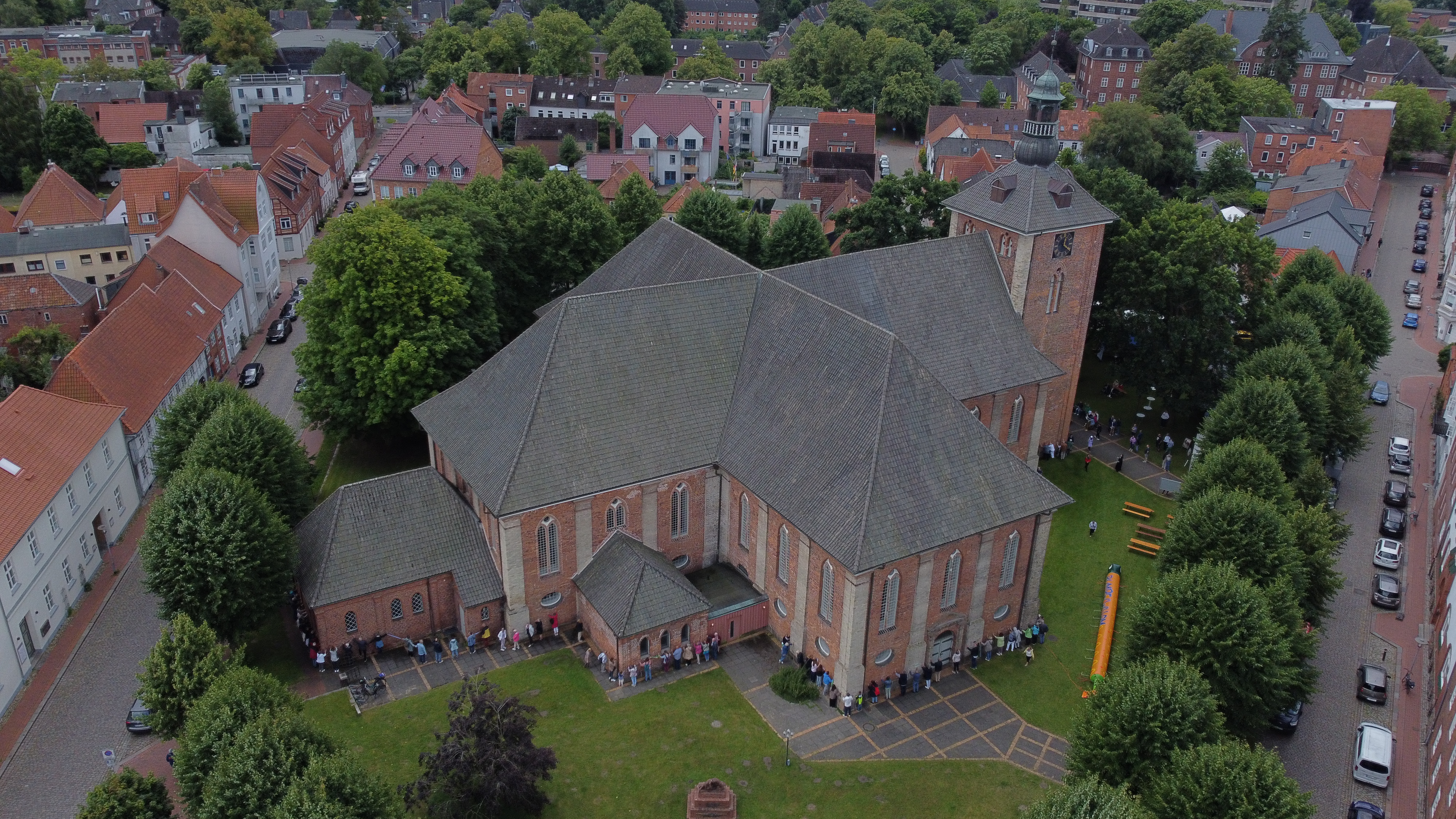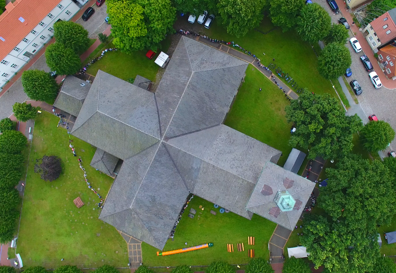 Zum Orgelnachspiel zog die Gemeinde aus, um ihre Kirche zu umarmen. Zwei lange Menschenketten starteten in beide Richtungen um die Kirche - die Freude war groß, als diese sich wieder trafen und die Aktion gelang. Danach gab es ein fröhliches Miteinander auf dem Rasen rund um die Christkirche. Viele beteiligten sich an dem Programm: Das Diakonische Werk des Kirchenkreises Rendsburg-Eckernförde, das Jüdische Museum, die Volkshochschule, der Weltladen, die Theaterfreunde, die Jugendkirche Rendsburg und Umgebung, das Team des Gemeinde-entwicklungsprozesses und der Förderverein zur Erhaltung der Christkirche. Für die Kleinen gab es Spielangebote, für die Ohren Musik vom Posaunenchor und ein Mitmachkonzert von Finn Böhme und Frederik Kleinschmidt, das wegen des guten Wetters kurzerhand nach draußen verlegt wurde. Die Rendsburger Musikschule gab ein Konzert in der Christkirche und rundete damit das Programm ab. Viele helfende Hände sorgten für das leibliche Wohl. Das Festgelände war mit den Fahnen der katholischen Gemeinde geschmückt. Das zeigte auch an diesem Tag das gute ökumenische Miteinander in Rendsburg.